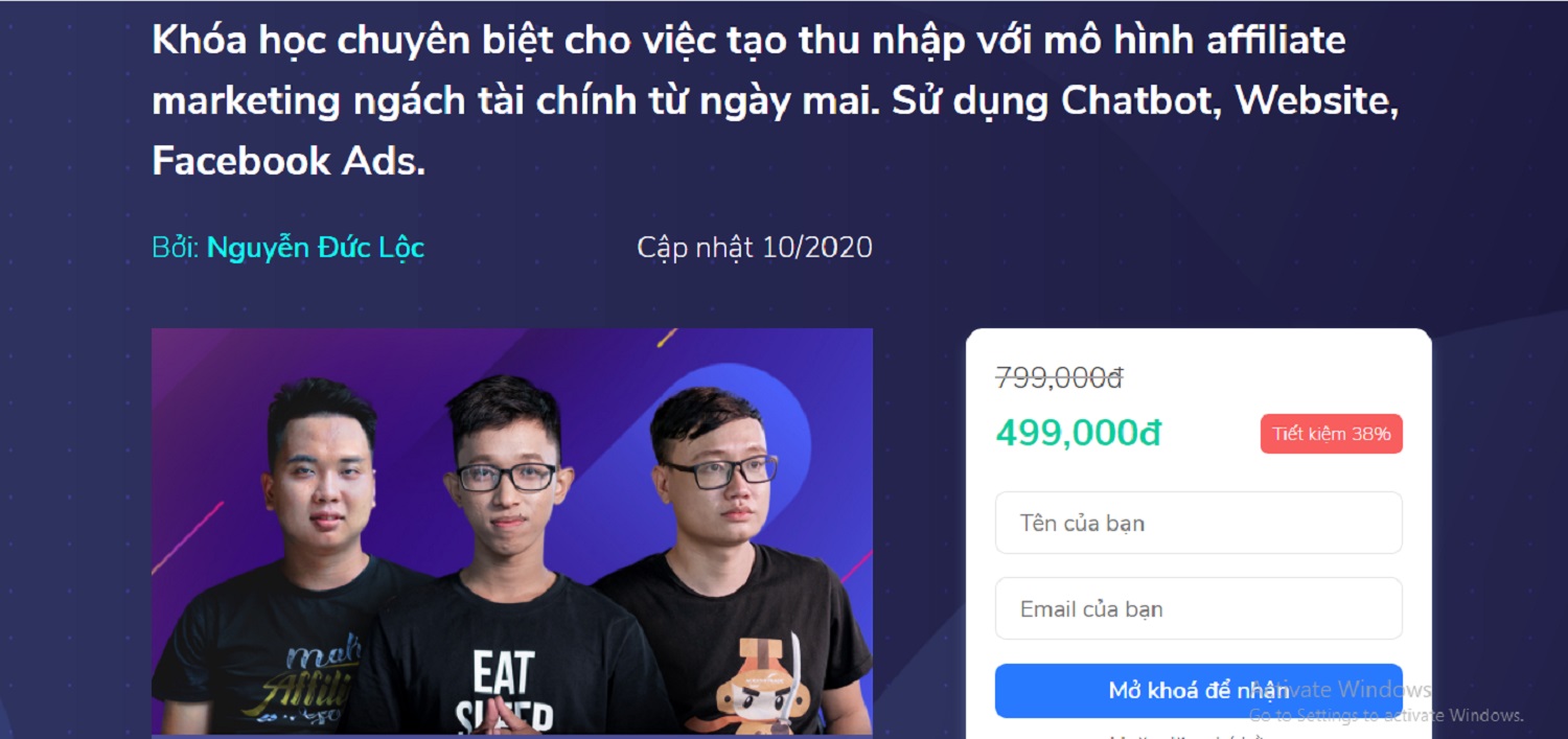 Đó chính là KH chuyên biệt cho việc tạo thu nhập với mô hình Affiliate Marketing ngách tài chính từ ngày mai. Sử dụng Chatbot, Website, Facebook Ads. Course này do nhóm các giảng viên: Nguyễn Đức Lộc, Dương Nhật Long và Nguyễn Trà đứng lớp.